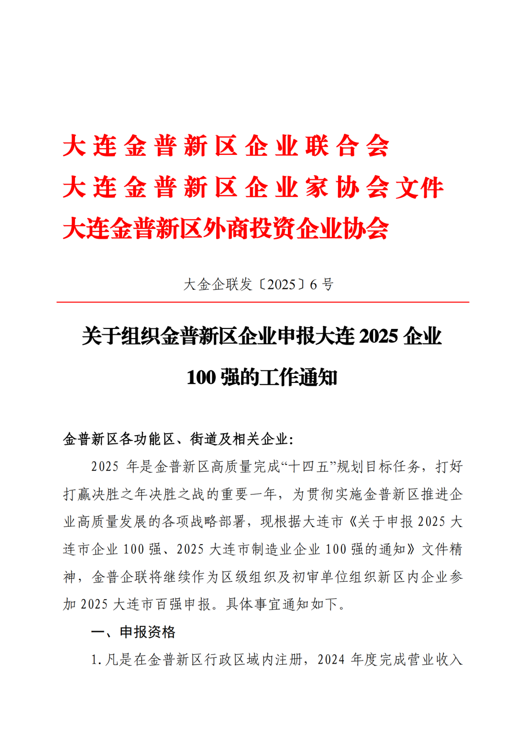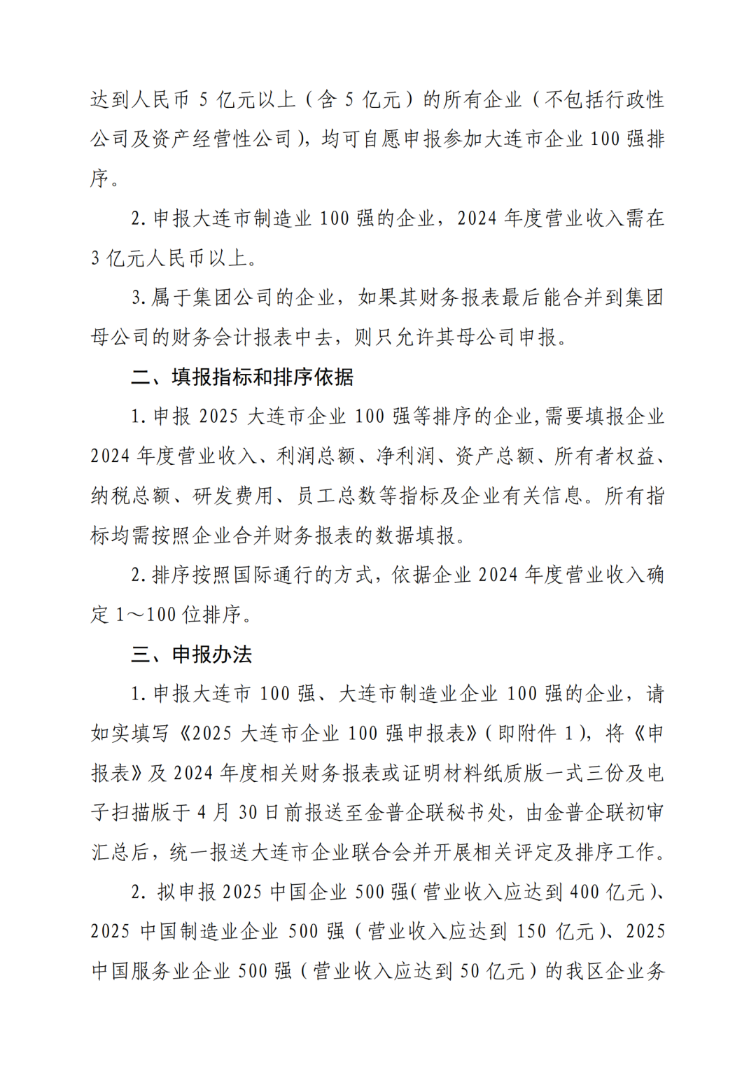 关于组织金普新区企业申报大连2025企业100强的工作通知