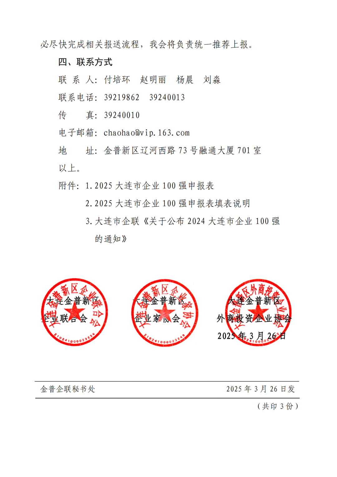 关于组织金普新区企业申报大连2025企业100强的工作通知.pdf附件1:大连市企业百强申报表.doc附件2:2025大连市企业100强申报表填表说明.pdf附件3:关于公布2024大连市企业100强的通知.pdf责编:金普新区企联