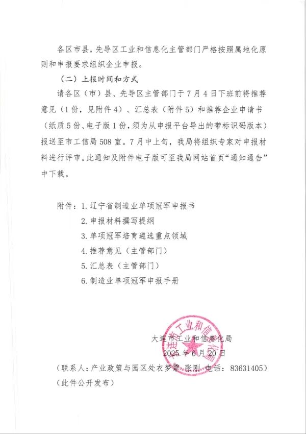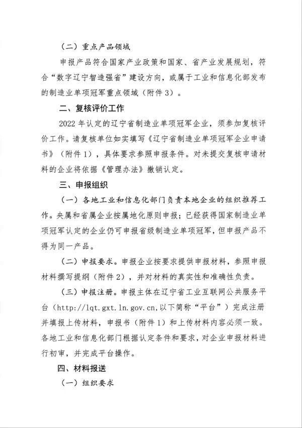 附件1辽宁省制造业单项冠军企业申请书.docx附件2申报材料撰写提纲.docx附件3制造业单项冠军企业遴选认定重点领域.docx附件4推荐意见.docx附件5推荐汇总表.xls编辑: 产业政策与园区处来源: 市工业和信息化局