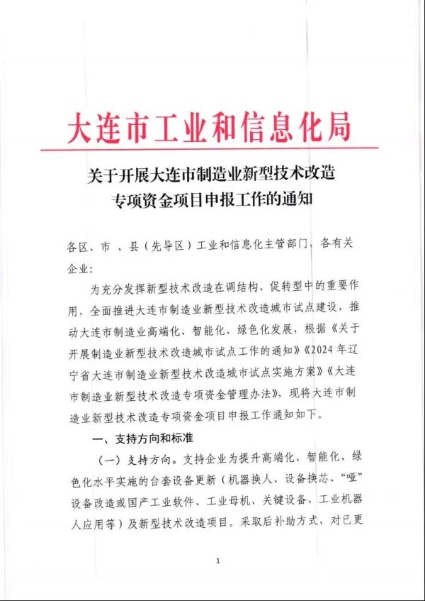 关于开展大连市制造业新型技术改造专项资金项目申报工作的通知