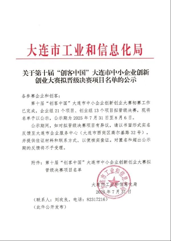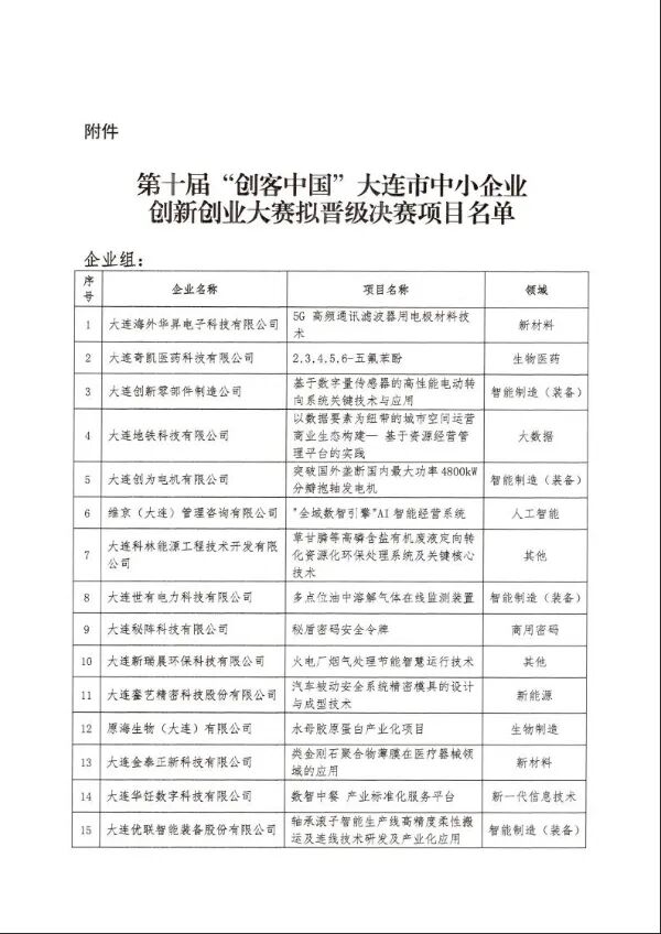 关于第十届“创客中国”大连市中小企业创新创业大赛拟晋级决赛项目名单的公示