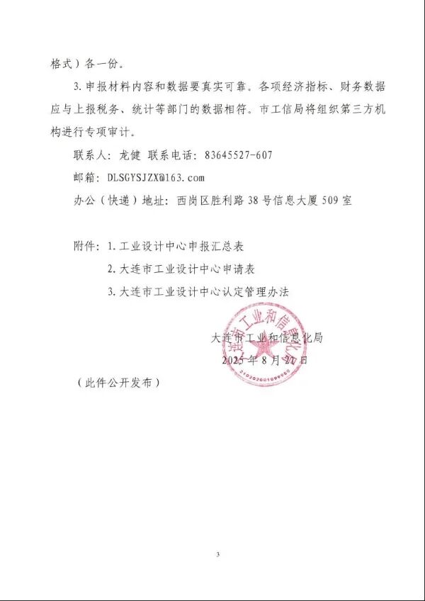 附件1.工业设计中心申报汇总表.xls附件 2大连市工业设计中心申请表.doc附件3大连市工业设计中心认定管理办法.pdf编辑: 科学技术处来源: 大连市工业和信息化局