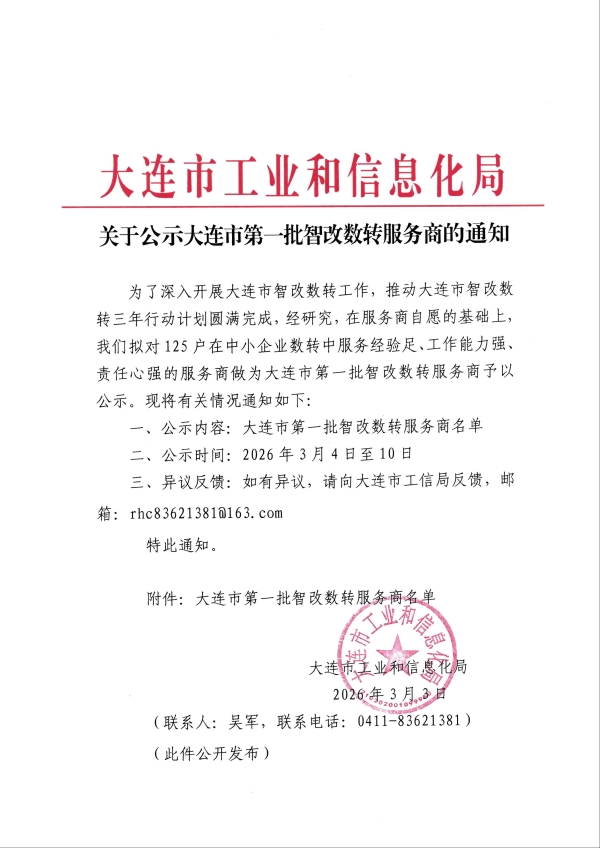 百汇咨讯关于公示大连市第一批智改数转服务商的通知附件-第一批智改数转服务商名单.xlsx 编辑: 两化融合推进处来源: 市工业和信息化局